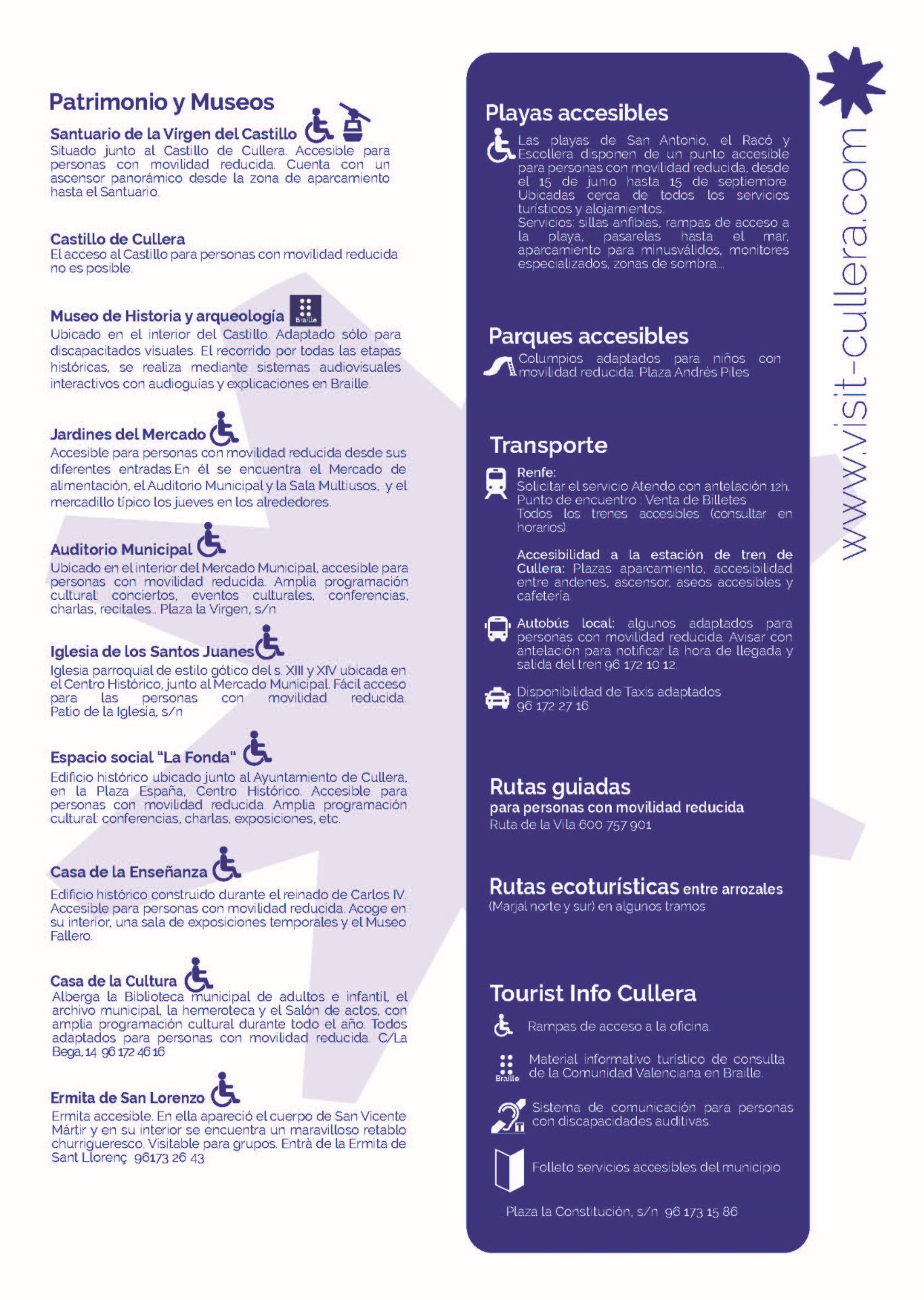 -Llocs accessibles per a persones amb mobilitat reduïda: Santuari del Castell, Jardins del Mercat, Esglèsia Sants Joans , Auditori Municipal, Espai Social "La Fonda", Casa de l´Ensenyança, Casa de la Cultura o Ermita de San Llorenç, platges adaptades de San Antoni, El Racó, i l´Escollera i parc accessible amb gronxador adaptat a la Plaça Andrés Piles.